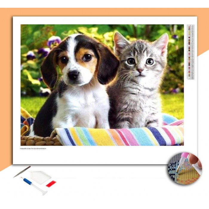 Confectionnez cette adorable broderie diamant et faites participer vos enfants pour les initier aux activités manuelle est minutieuses. Le petit chien & le petit chat représentés sur celle-ci attendriront votre entourage. Vous pourrez l'afficher dans la chambre de vos enfants ou l'offrir à une personne de votre choix.