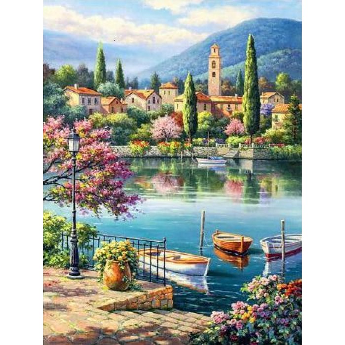 Un havre de paix : un petit village situé près d'un lac au milieux des montagnes entouré d'une riche végétation colorée qui laisse tout naturellement place à paix intérieur et à la rêverie. On s'y voit se promener et respirer un air pur. Cette broderie diamant parfaitement équilibrée saura délicatement parfaire votre intérieur.