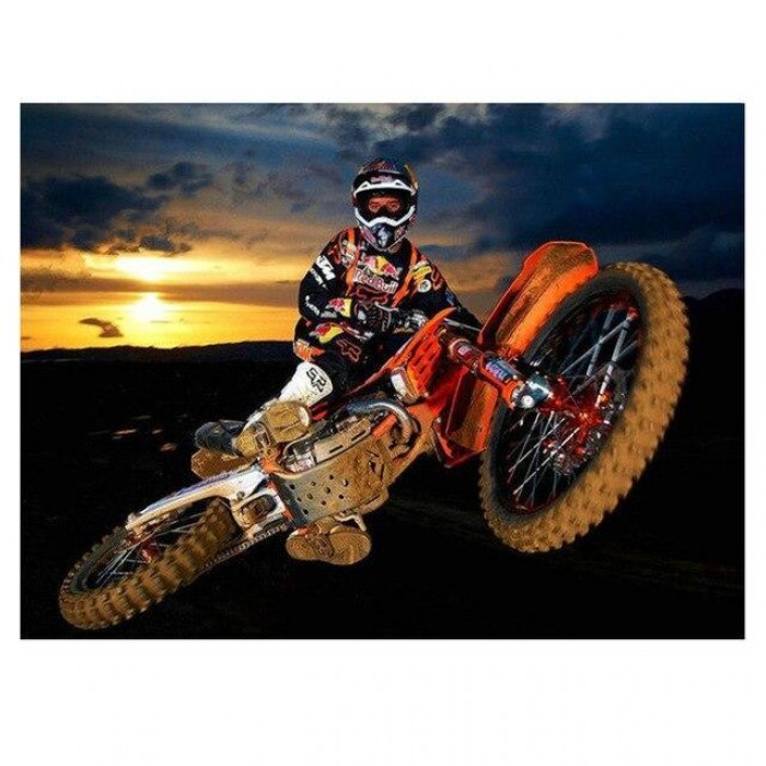 Le pilote de motocross effectue une cascade de moto qui se rapproche presque du soleil couchant. La manœuvre professionnelle est épatante, car elle crée un itinéraire spectaculaire dans les airs. Par l’action heureuse de cette broderie diamant, votre maison sera le meilleur endroit pour appréciez cette œuvre conçue de toute pièce par vos soins.