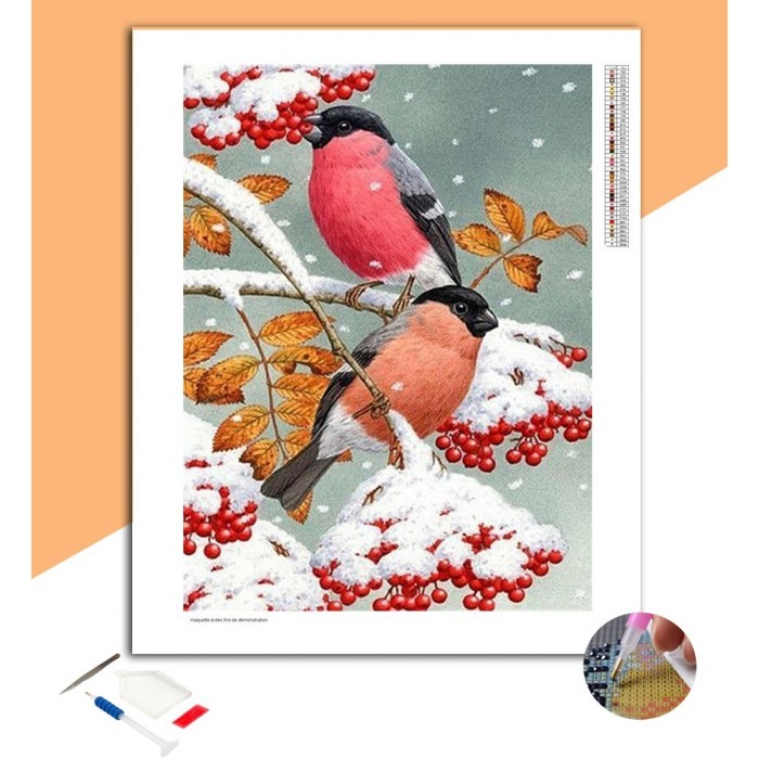 Connaissez-vous ces magnifiques petits oiseaux représentés sur cette broderie diamant ? Ce sont des Bouvreuils pivoine. Ces derniers vivent se se nourrissent en couple. Ce couple, dont un orange et un rouge sont signe de fortune et portent chance. Une fois terminée vous pourrez accrocher cette broderie dans votre lieu de vie afin qu'elle vous apporte des ondes positives.