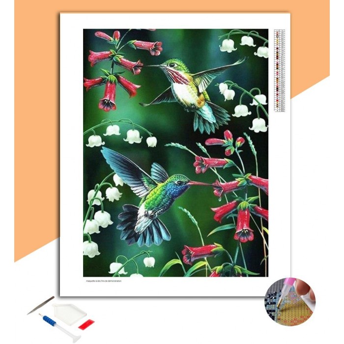 Les colibris sont des oiseaux représentant la joie de vivre, l'intelligence et la liberté. Cette broderie diamant est pleine d'espoir et de bonheur grâce à ses petits êtres ainsi qu'au muguet, fleur porte bonheur du mois de mai. Les couleurs vivent rendent vivante l'oeuvre et apporteront de la bonne humeur dans la pièce où elle sera exposée.